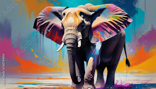 Cheerful elephant on a colorful splattering background. Artistic rendition. Generative AI.