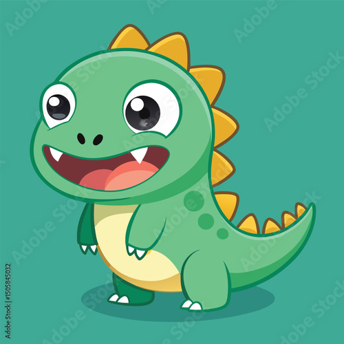 Cheerful green cartoon dinosaur smiling with big eyes and yellow spikes against teal background