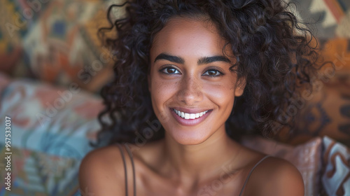 cheerful Hispanic woman sits on a vibrant couch, smiling at camera