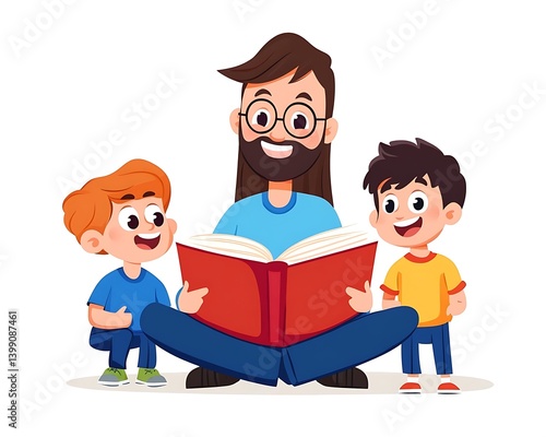 Cheerful man reading a book to two happy children in a bright and colorful illustration