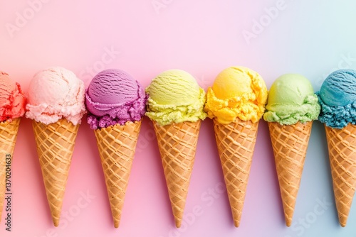 Cheerful rainbow-colored ice cream cones with vibrant flavors against a soft pastel background on a bright sunny day