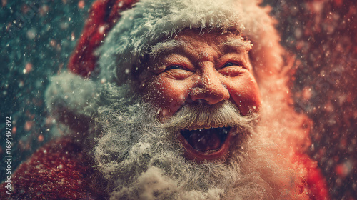 Cheerful Santa Claus with joyful expression, surrounded by falling snowflakes, creating magical winter atmosphere. His fluffy white beard and red suit add to festive spirit
