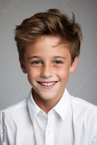 Cheerful smiling elegant funny schoolboy on light studio background. Generative AI