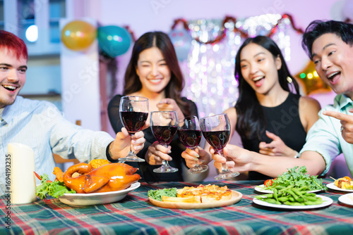 Cheerful young friends celebrating at a cozy home party, toasting with wine, enjoying food, laughing together in a festive
