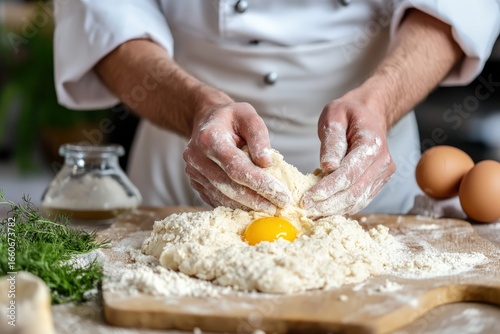 Chef adding egg yolk to flour, making dough for pasta