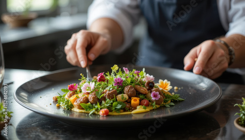 Chef carefully arranges slow food organic dish adorned with vibrant flowers and fresh