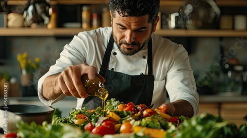 Chef Drizzling Olive Oil on Vibrant Salad Surrounded by Fresh Vegetables in Cozy Kitchen Setting