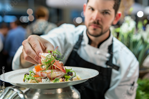 Chef Garnishing Exquisite Seafood Dish in Professional Kitchen