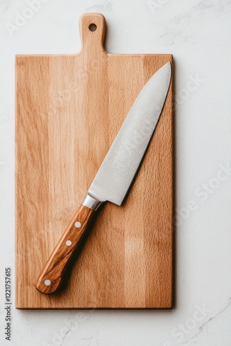 Chef Knife Resting on Wooden Cutting Board in High Fidelity Image