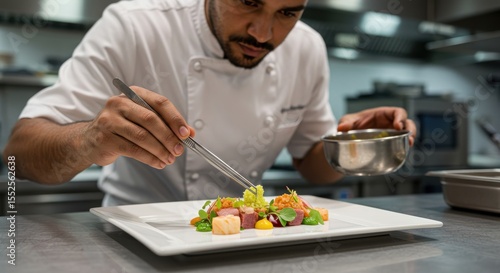 Chef meticulously preparing a colorful gourmet dish using chopsticks in a modern kitchen setting