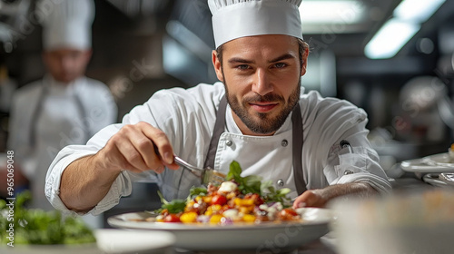 Chef plating a salad in a professional kitchen.