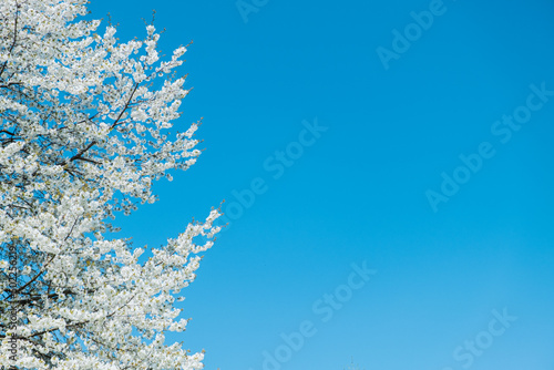 Cherry blossom. Blooming cherry tree in bright sunny day with clear blue sky on background.