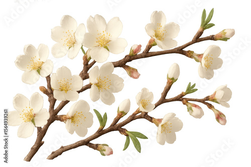 Cherry blossom branches spreading delicate white petals, pink flower buds emerging among vibrant green leaves on clear backdrop
