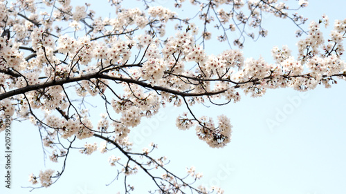 Cherry blossom trees in full bloom in the blue spring sky.