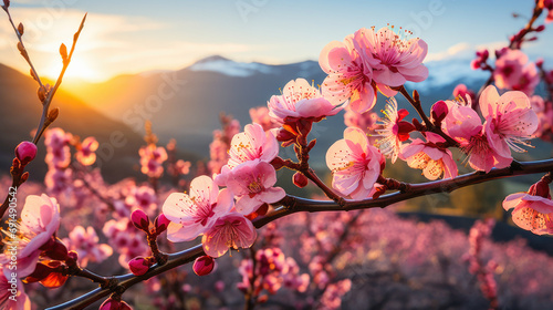 Cherry Blossoms at Branches at Sunset with Mountain Backdrop