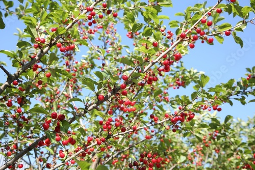 Cherry tree with ripe red berries against blue sky outdoors, low angle view