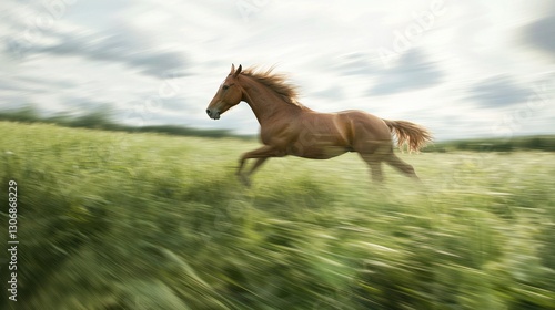 Chestnut horse galloping across a field.