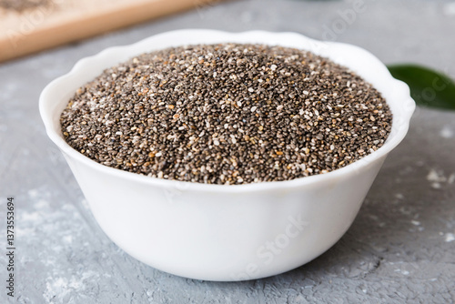 Chia seeds in bowl on colored background. Healthy Salvia hispanica in small bowl. Healthy superfood