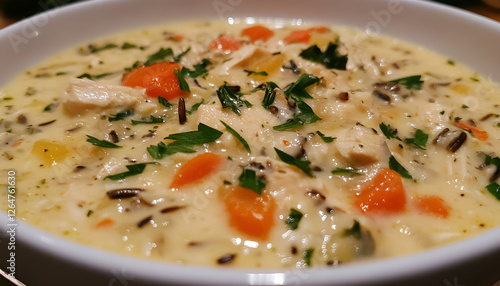 Chicken and Wild Rice Soup. Homemade fresh creamy soup with chicken, vegetables and wild rice in white bowl close up