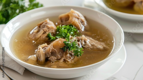 Chicken broth with meat and bones in a white bowl