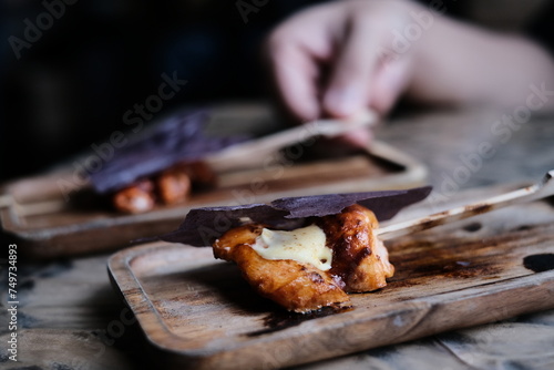 Chicken skewers with sauce on a plate over a light grey slate, stone or concrete background. in Hong Kong fine diningrestaurant