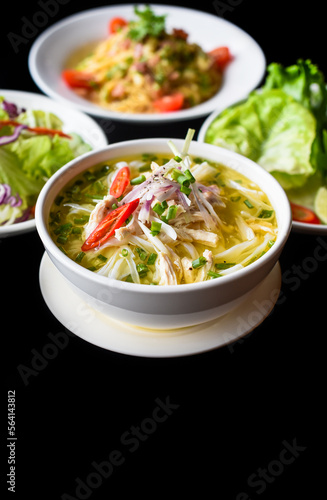 Chicken soup Pho ga in vietnamese style on black background with banh mi bread, salad and pasta carbonara
