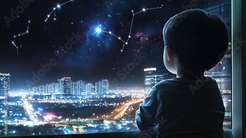 Child at window gazing at modern city and stars