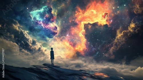 Child gazing cosmic nebula, dreamscape