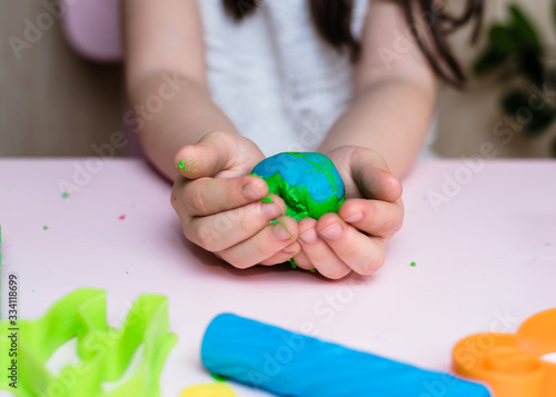 Child hands playing with colorful clay. Homemade plastiline. Plasticine. play dough. Girl molding modeling clay. Homemade clay.