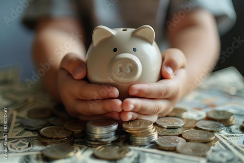 Child holding a piggy bank surrounded by coins and dollar bills, symbolizing savings, finance, and investment.