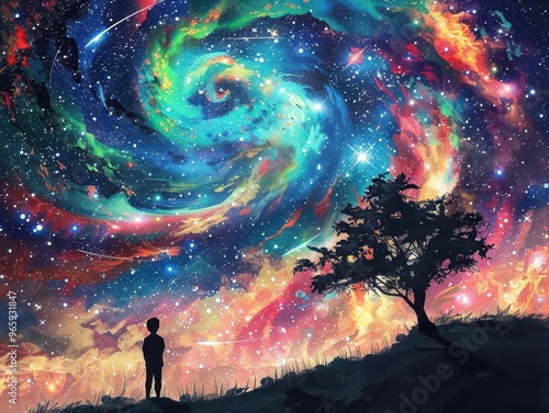 child stargazing on hilltop silhouette against vibrant cosmic sky swirling galaxies shooting stars and nebulae create a fantastical tapestry atmosphere of wonder and infinite possibilities