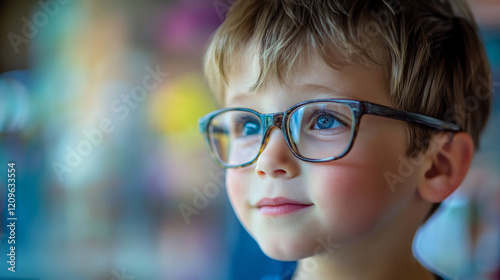 Child with glasses gazing thoughtfully at colorful surroundings during a bright day indoors