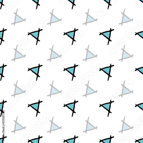 Childlike Triangles grid of sketched triangles with blue center Hand drawn vector seamless repeat pattern with ink doodles. surface pattern design
