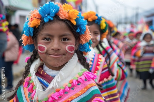 Children dressed in colorful costumes participate in an outdoor festival, displaying their cultural traditions and festive spirits through vibrant attire and cheerful expressions.
