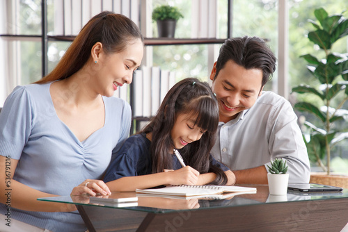 Children education and home school concept : Young asian father and mother see little daughters' study. Excited smiling small child girl enjoying learning and reading with pleasant dad and mom at home