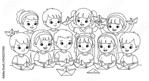 Children making paper boats coloring page printable activity for kids art and craft fun on transparent background
