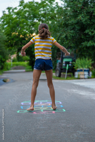 Children play hopscotch on the street. Selective focus.