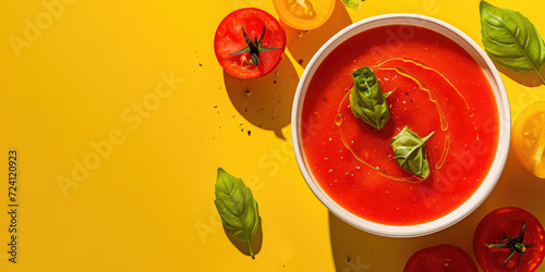 Chilled Gazpacho Soup with Diced Vegetables. Gazpacho soup topped with finely diced vegetables and parsley, served in a bowl, copy space.