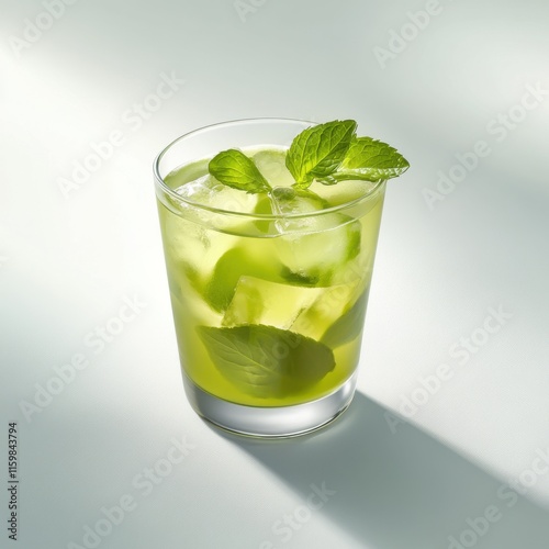 Chilled green tea in a glass tumbler. Featuring mint leaves and lime wedges