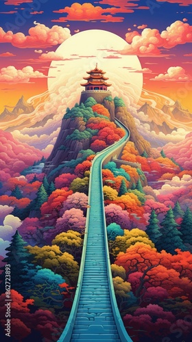 China great Wall Digital Art illustration landscape during sunset or sunrise. Abstract colorful minimal style digital graphic art painting Landscape
