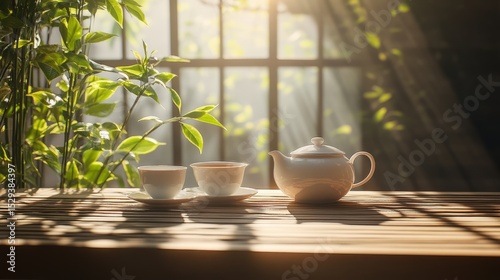 Chinese asian tea ceremony. Green tea in the teapot and small cups