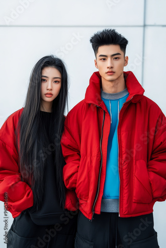 Chinese couple models in casual streetwear oversized jackets cool tones empty urban background posing confidently