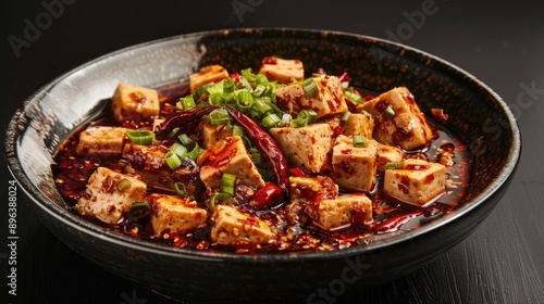 Chinese Mapo Tofu garnished with chilis on black backdrop