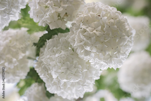 Chinese snowball white flowers closeup - flowering shrub in spring