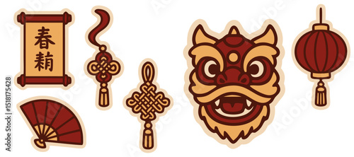 Chinese Tradition Vector Stickers – Lion Dance, Lantern, Chinese Knots, Fan and Scroll – Transparent Background