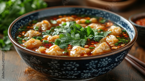 Chinese wonton soup served in a deep bowl with fresh cilantro and chili oil