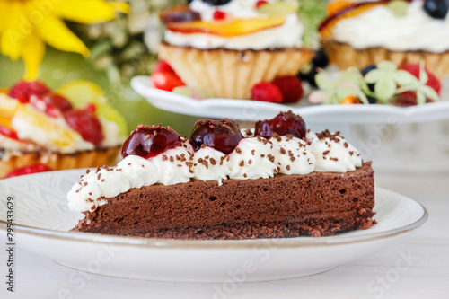 Chocolate cake with whipped cream decorated with cherries in a sweet sauce.