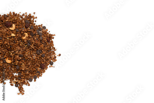 Chocolate granola cereal with nuts.