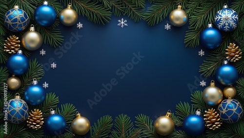Christmas & New Year Banner: Blue Baubles, Golden Stars & Frosted Pines on Dark Background | Perfect for Holiday Designs & Invitations