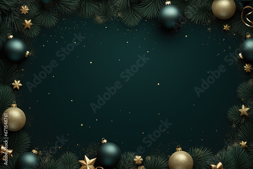 Christmas and New Year background with fir tree branches, golden stars, balls, and snowflakes. Vector illustration.